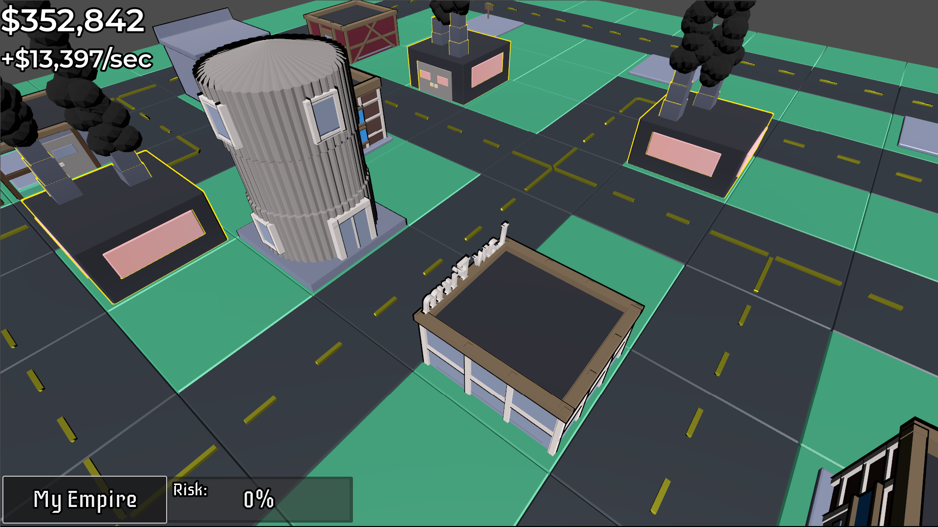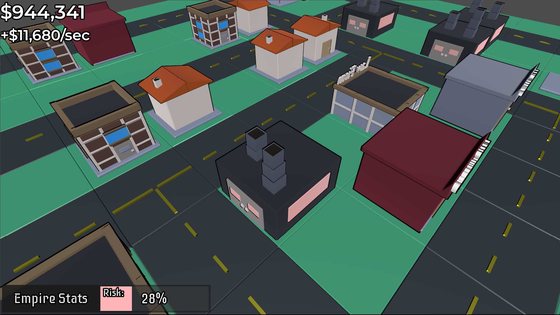 There are nine unique properties, each with different behaviors and effects. The ethical risk and lawsuit systems are fully implemented. Passive income and property scaling work as intended. The game is fully playable with just the mouse and is designed to feel smooth and responsive while you grow your empire.